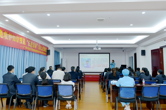瑞康醫(yī)院副主任醫(yī)師黃清玉、龔斌為大家講授應(yīng)急救治的理論知識(shí)。他們通過多個(gè)生動(dòng)的案例突出救命的黃金時(shí)間重要性,強(qiáng)調(diào)突發(fā)事件現(xiàn)場(chǎng)第一目擊者(第一反應(yīng)人)為傷病員提供心肺復(fù)蘇操作的必要性,傳播“人人學(xué)急救、急救為人人”的理念。他們以通俗易懂的方式深入淺出地講解了應(yīng)急救護(hù)理論知識(shí)、高質(zhì)量心肺復(fù)蘇(CPR)、自動(dòng)體外心臟除顫器(AED)的使用、氣道異物梗阻的處理方法,告訴學(xué)員們更好地解決“何時(shí)救、誰來救、怎么救”的問題,培養(yǎng)學(xué)員既要有見義勇為的意識(shí),更要具有見義智為的知識(shí)和技能。