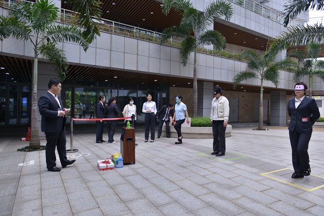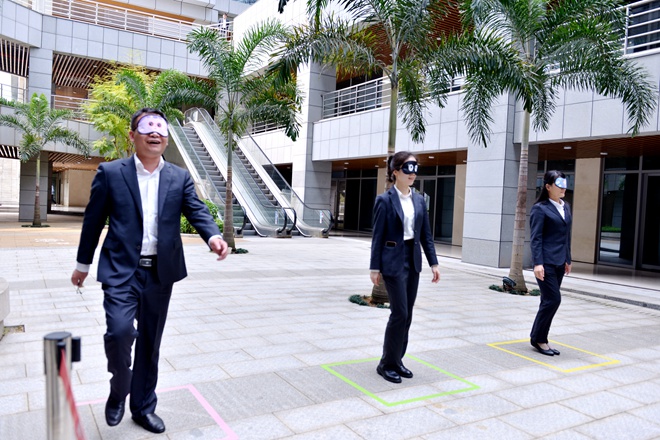“原地踏步走”需要參與者在方框內(nèi),蒙眼行走30秒,不走出方框的,則可以獲得一張獎券。一開始,參與者們都信心滿滿,走著走著就偏離了方向,惹得“圍觀群眾”哈哈大笑。
