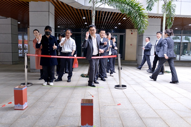 在“蒙眼敲鑼”的活動現(xiàn)場,要求參與者戴上眼罩直行去敲鑼。一帶眼罩,參與者就找不到了方向,不經(jīng)意的忙亂動作,惹得場外的觀眾陣陣歡笑。